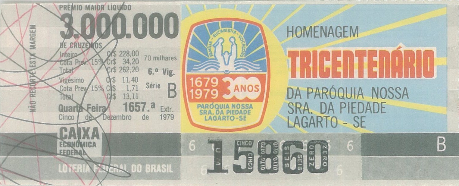 Série Economia, extração 1657 com tema Homenagem Tricentenário da Paróquia Nossa Sra. da Piedade - Lagarto - SE. Extraída em: 05/12/1979
